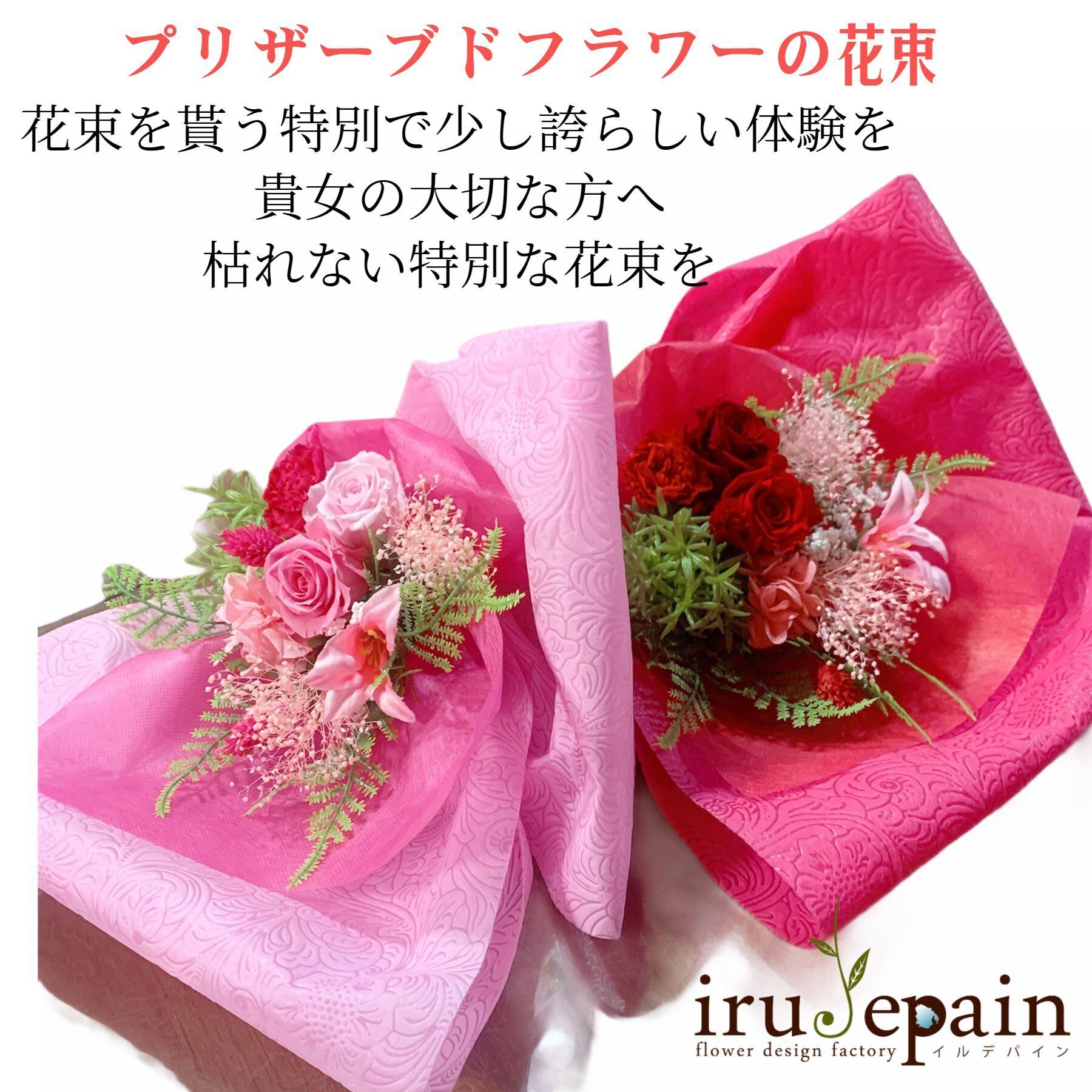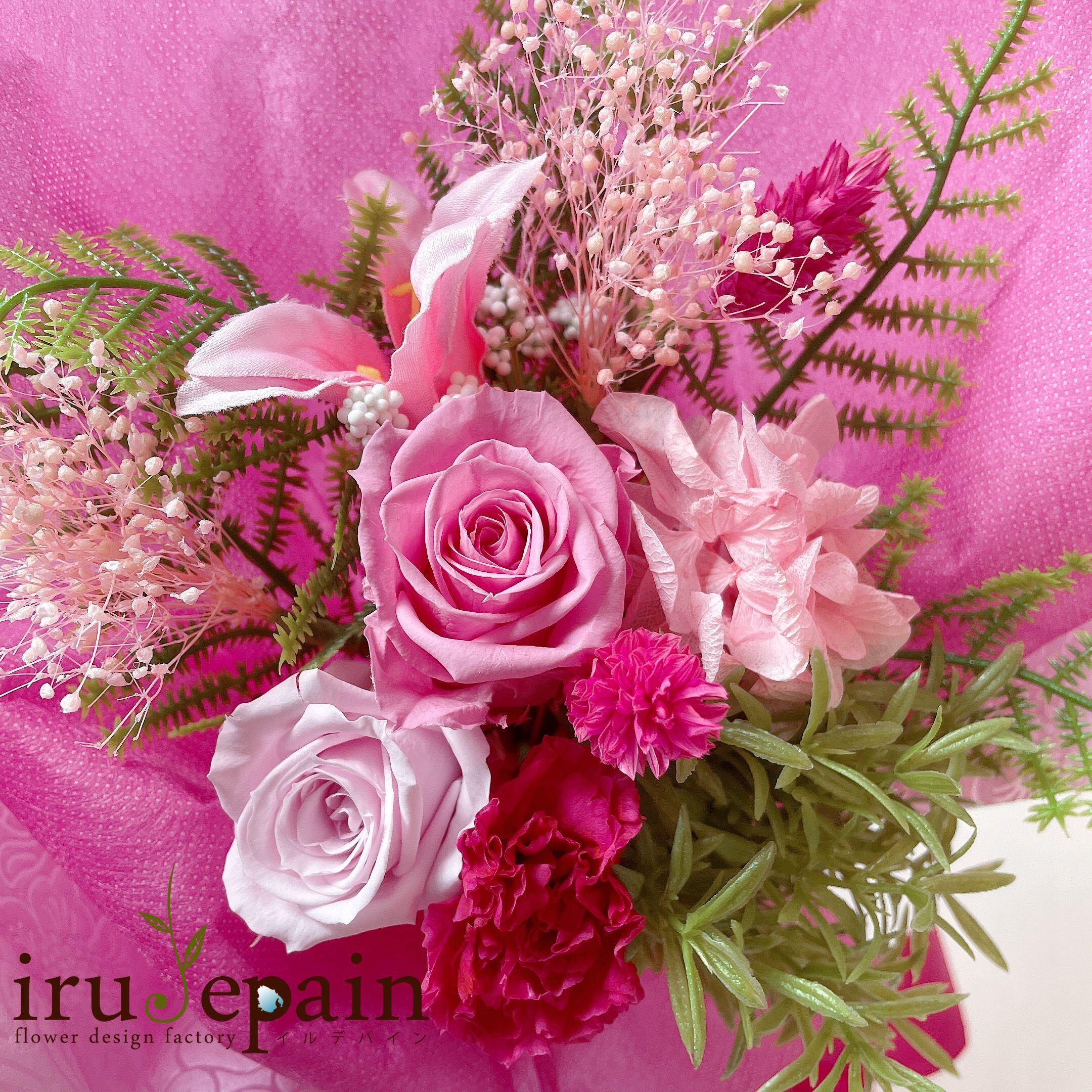 【プリザーブドフラワー 花束】 「ローズフラワープティーフェリーチェ」花束 ピンク プリザーブドフラワー バラ カーネーション ギフト プレゼント 母の日 誕生日 | irudepain フラワー✧ブーケ✧髪飾り 花職人の店